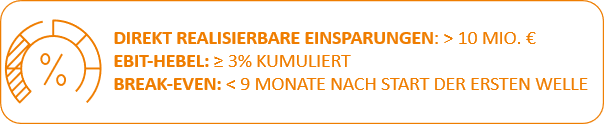 Result: Through a targeted transformation in procurement, the client was able to develop purchasing from a pure cost factor into a strategic value generator: €10 million savings, ≥ 3% cumulative EBIT leverage, < 9 months break-even.