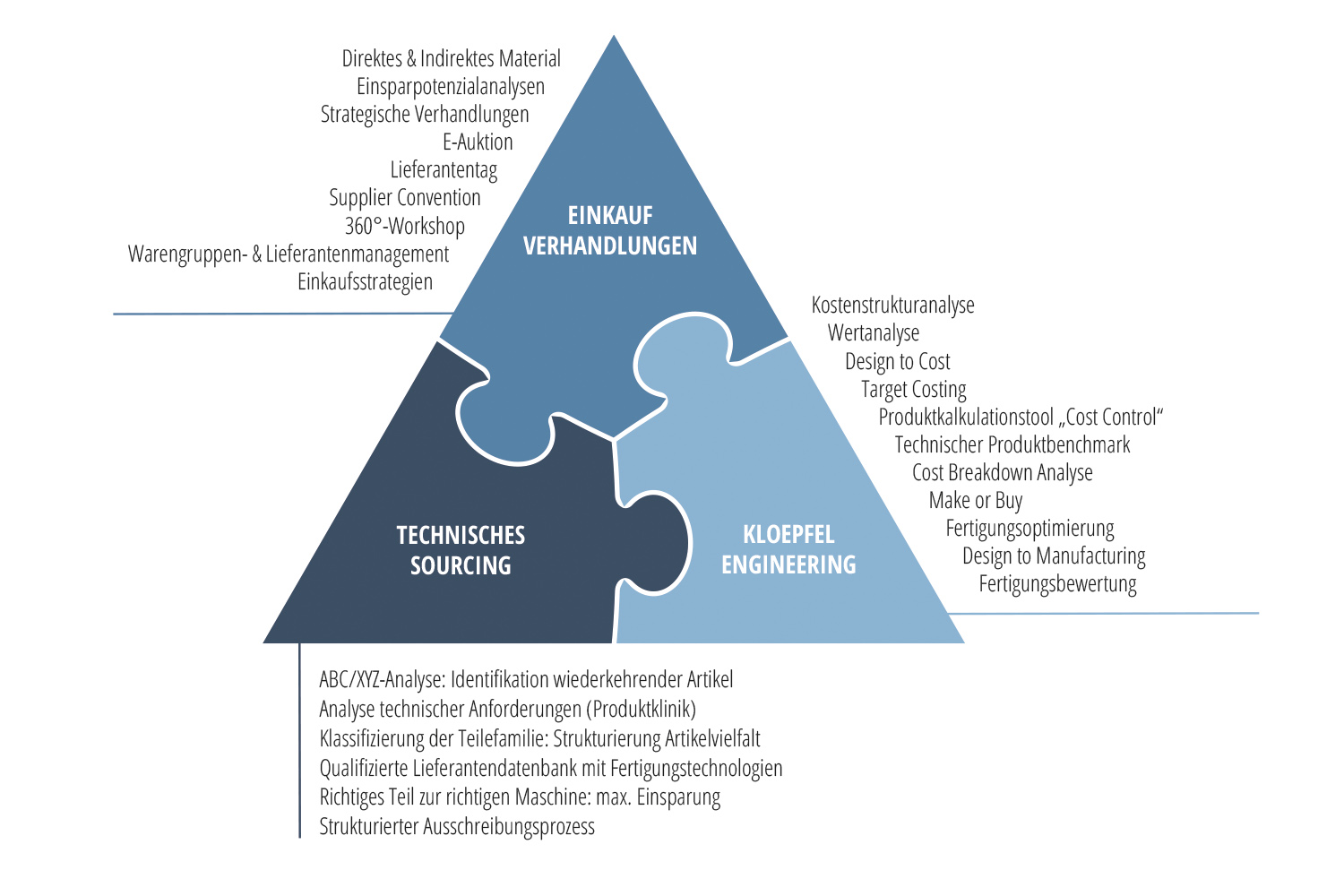 Das einzigartige Technisches Sourcing von KLOEPFEL Consulting bietet hier konkrete Lösungsansätze mit messbaren Einsparpotenzialen und einer Win-win-Strategie für alle Beteiligten. Die Einkaufsberatung Kloepfel Consulting hat das Thema systematisch erschlossen und spricht vom „Erfolgsdreieck“ aus: